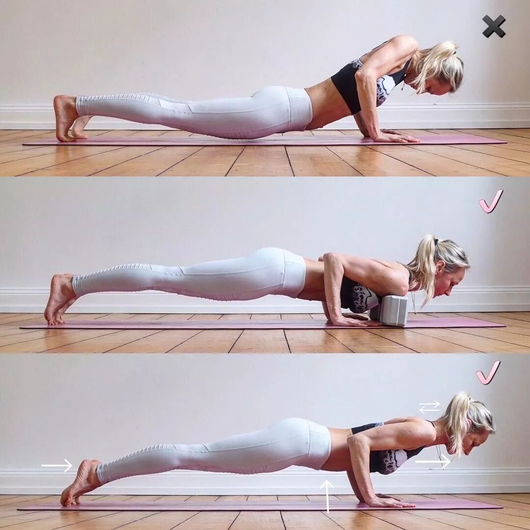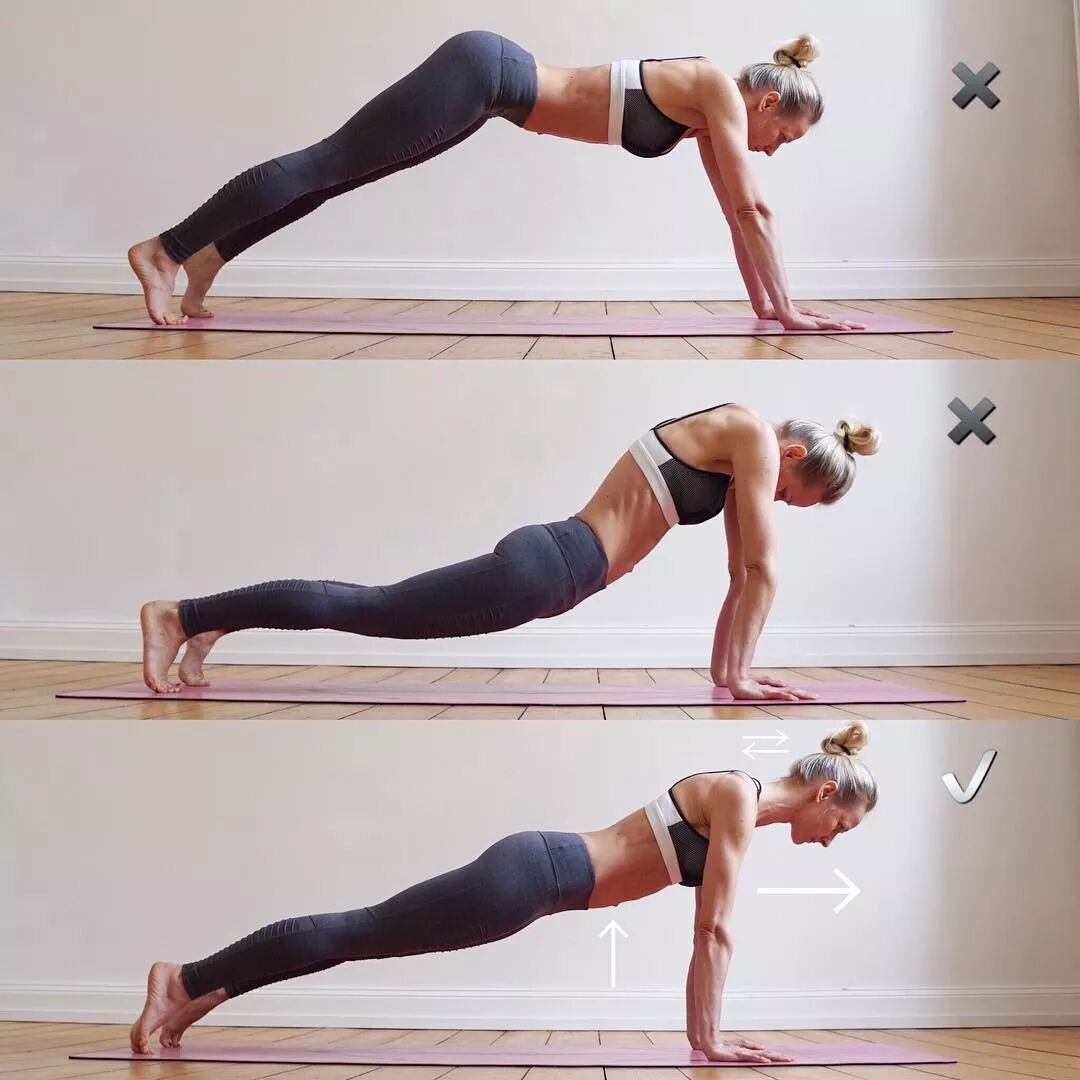 由于核心力量不足或者还没有学会如何启动核心的时候,瑜伽初学者要么容易翘臀,要么就是撑不起髋部,此时要注意双脚以及头部带领延展脊柱,双脚以及头部像绳子的两端,用力的将身体拉成一条直线。